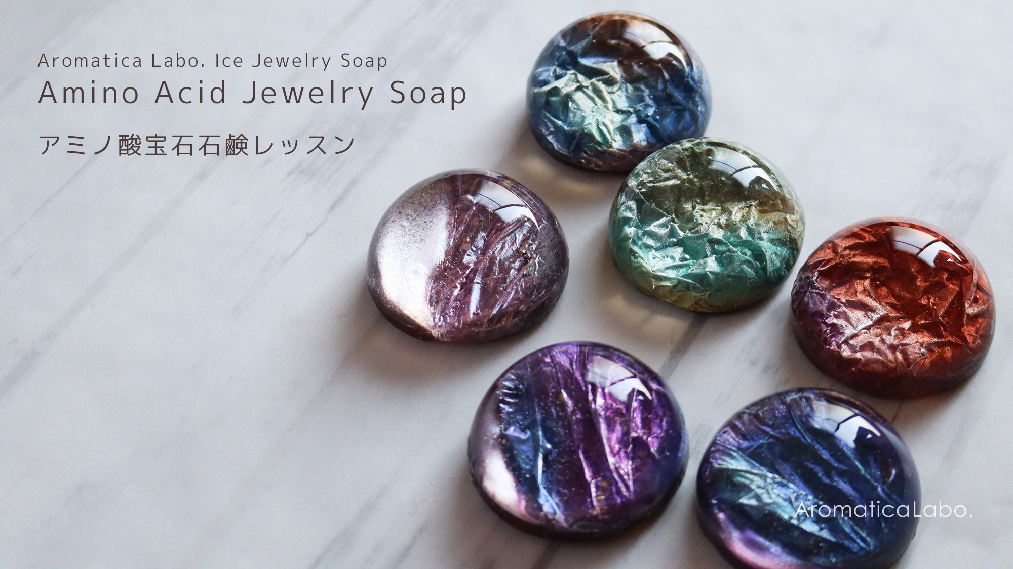 Making Amino AcidJewelry Soap from the amino acid soap base. Making three types of jewel soaps, Aurora, Shining, and Fine Cracks, which sparkle and shine like real gems, and wrap them beautifully.