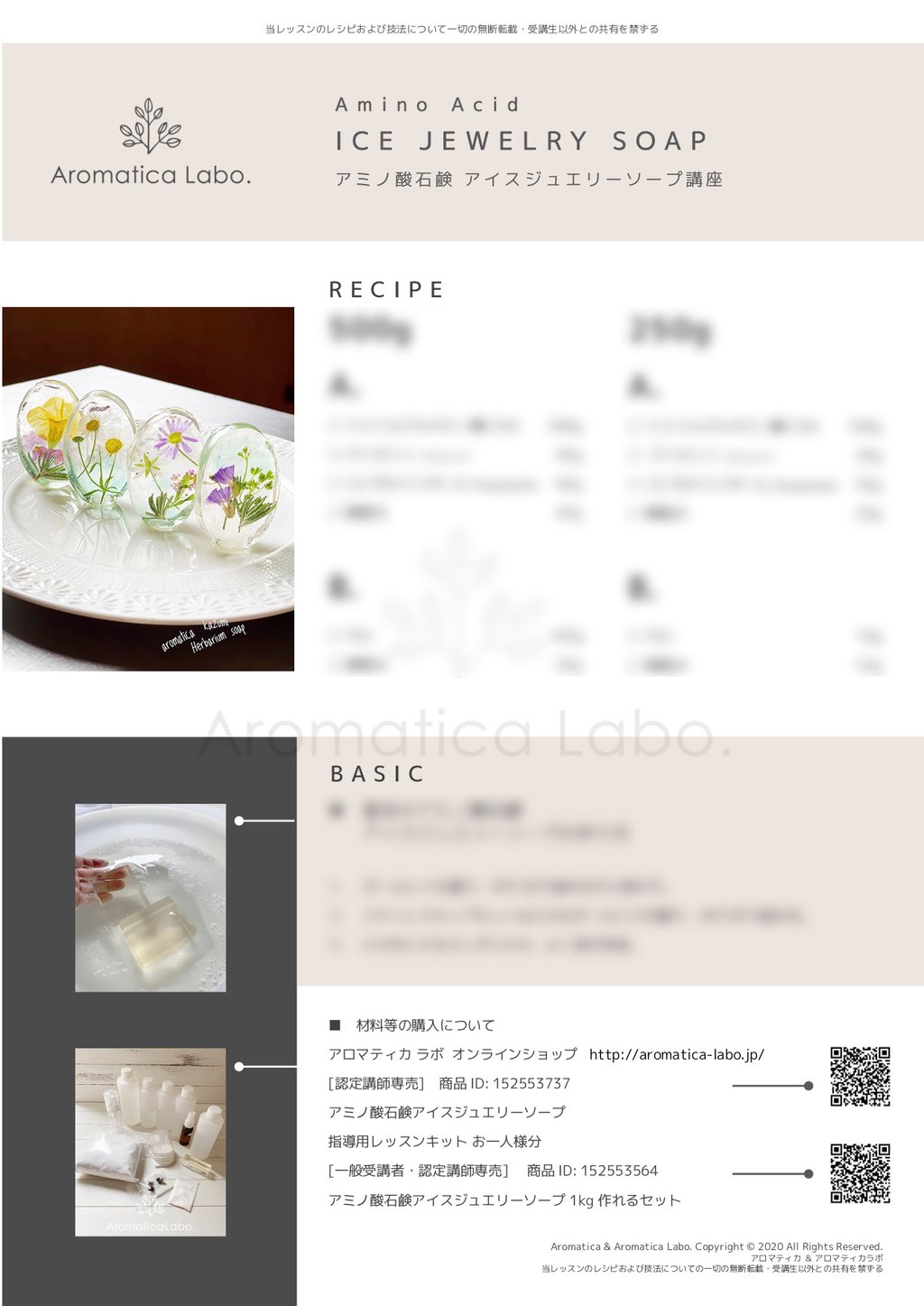 アミノ酸石鹸の基本の作り方から、クラック・グラデーションなどの技術・お花を閉じ込めたハーバリウムソープなどの応用まで、透明度と美しさにこだわったアロマティカのアミノ酸石鹸を学びます。